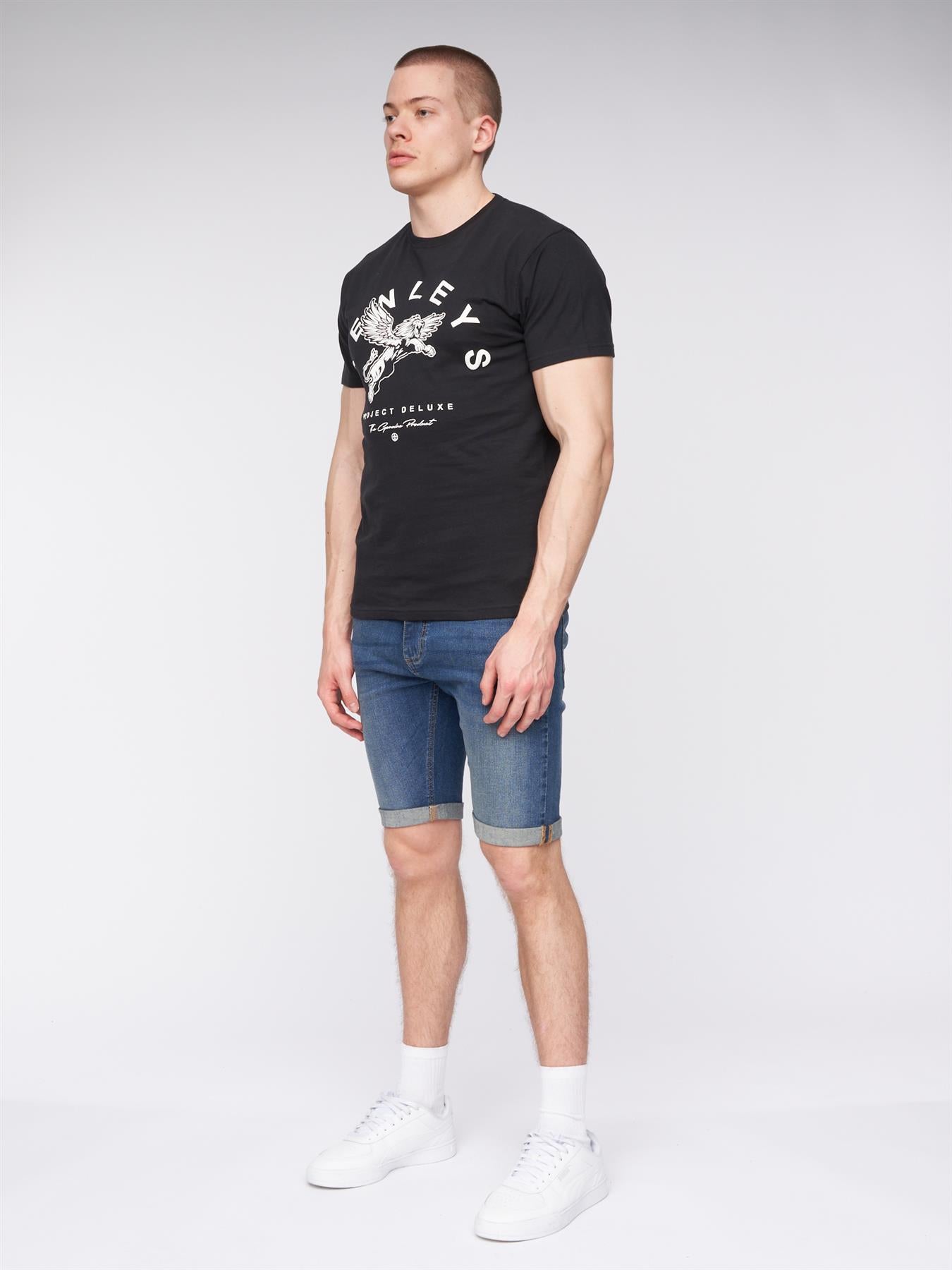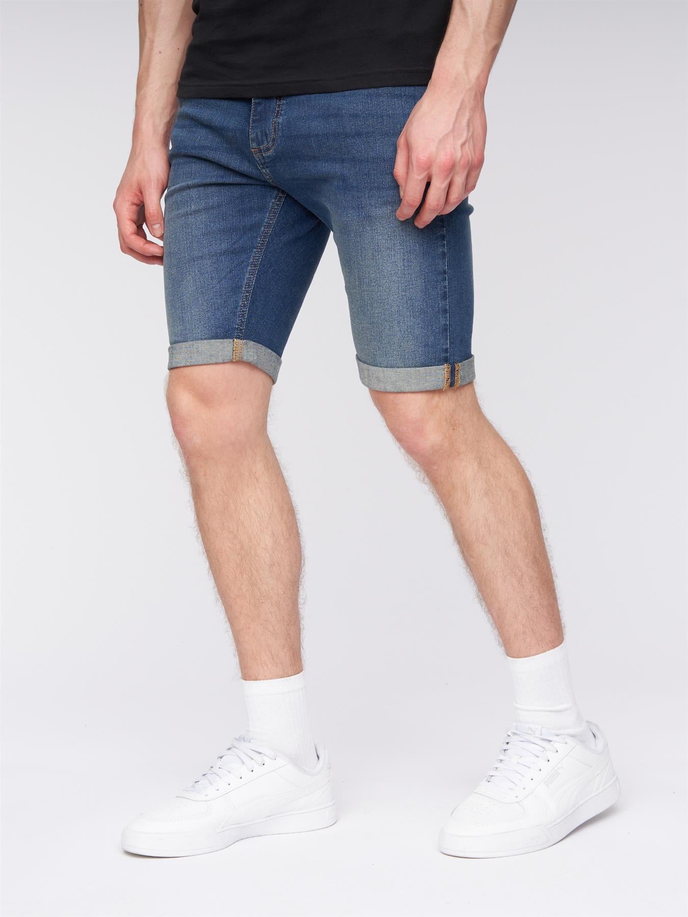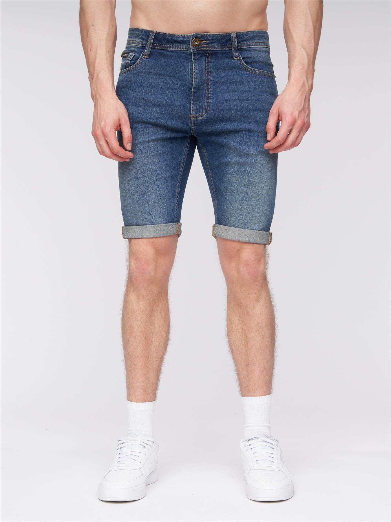Discover our Men's Skinny Fit Denim Shorts, perfect for summer outings. With a rolled-up hem and branded metal shank button fastening, they offer both style and functionality. Complete with scooped front pockets and a woven rubber label, they're a must-have for your wardrobe.